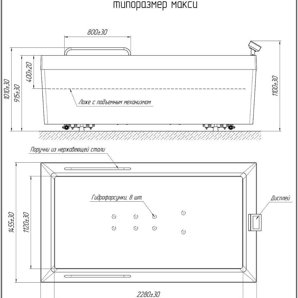 Размеры ванны (без учета дисплея и поручней) (ДхШхВ), мм 2610х1455х915